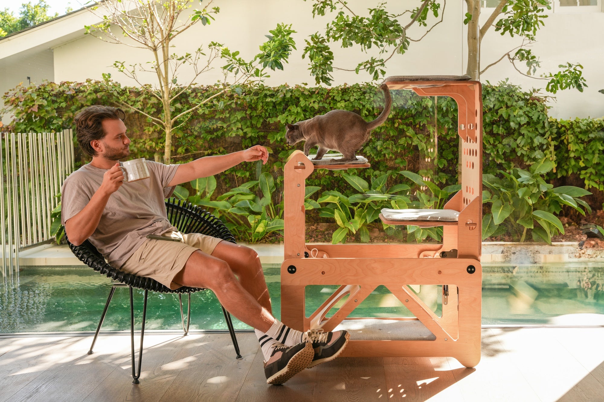 特許取得済みの折りたたみ式システムは、オーストラリアで誇りを持って設計されています。最高級合板で作られたこのベンチタワーは、市場で最も洗練された猫用家具です。あなたとあなたの家、そしてあなたの猫のことを考えた、他に類を見ないデザインです。