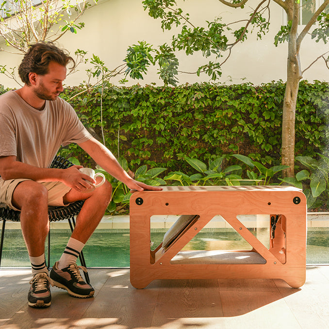 特許取得済みの折りたたみ式システムは、オーストラリアで誇りを持って設計されています。最高級合板で作られたこのベンチタワーは、市場で最も洗練された猫用家具です。あなたとあなたの家、そしてあなたの猫のことを考えた、他に類を見ないデザインです。